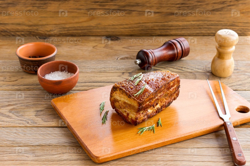 Домашнее копченое барбекю из говяжьей грудинки на деревянной разделочной доске перед нарезкой