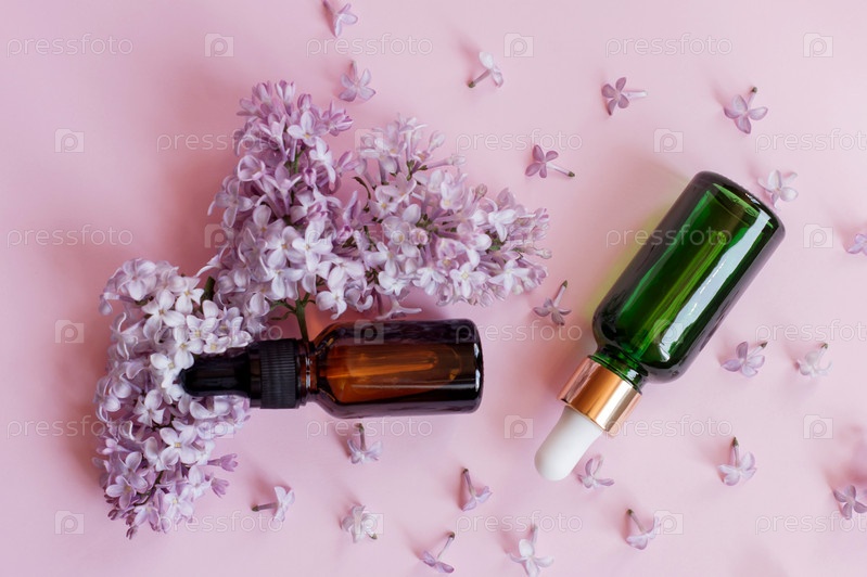 Макет стеклянных бутылок-капельниц на розовом фоне с сиреневыми цветами. Небрендированная косметическая пипетка-сыворотка