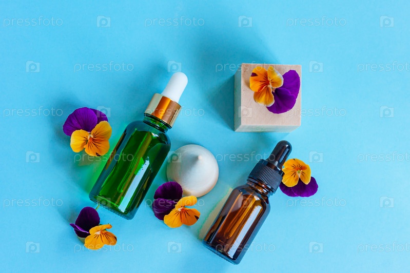 Стеклянные бутылки сыворотки с пипеткой и красивыми цветами альта на синем фоне. Натуральная органическая спа-косметика. Вид сверху