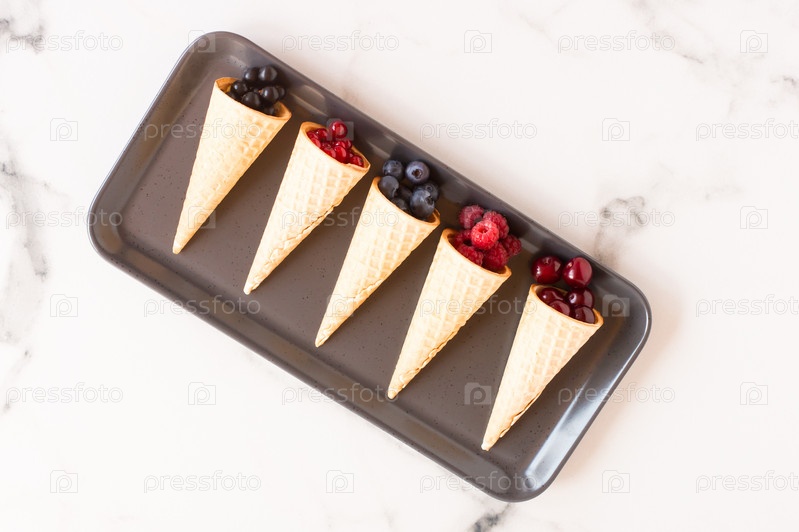 Вафельный рожок с замороженными ягодами смородины на белом фоне, концепция сочного мороженого, крупным планом
