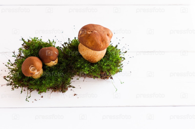 Состав этих белых лесных грибов во мху на белом деревянном столе