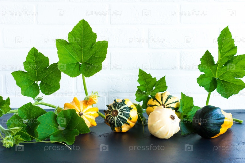 Декоративные тыквы с листьями на фоне белой кирпичной стены. осеннее украшение