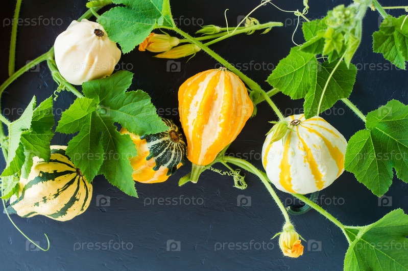 Различные осенние тыквы на черном фоне. осенний натюрморт