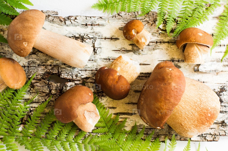 Композиция с белыми осенними грибами на фоне папоротника и бересты. вид сверху