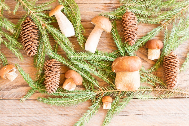 Композиция из белых грибов и еловых веток с шишками на деревенском столе