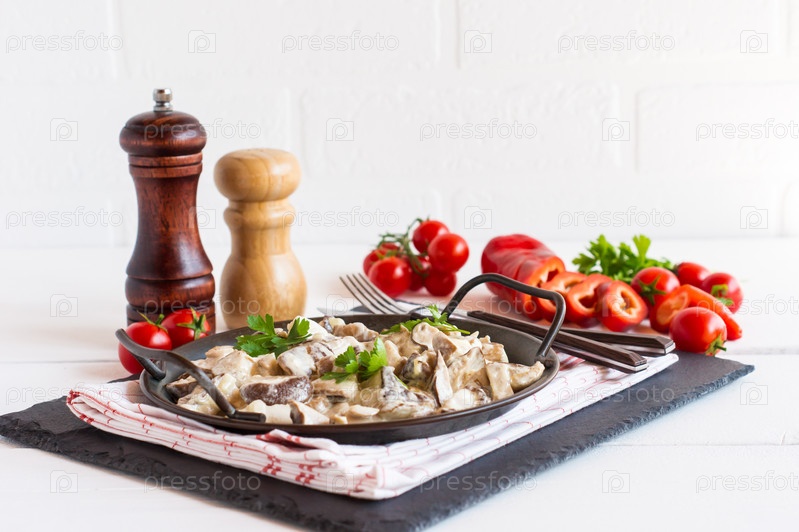 Грибной соус со сливками и сыром в сковороде на белом столе