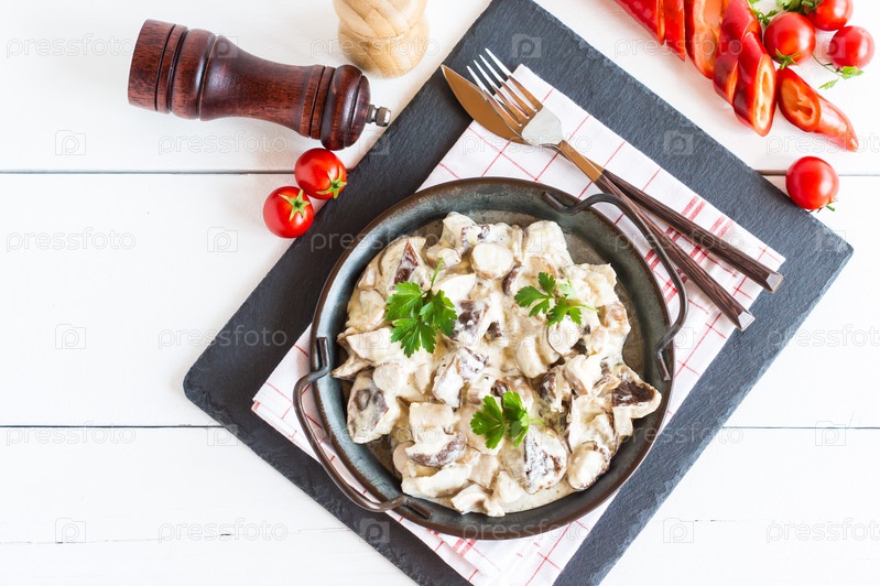 Сливочно-грибной соус с кусочками белых грибов со специями на сковороде. вид сверху. белый деревянный фон