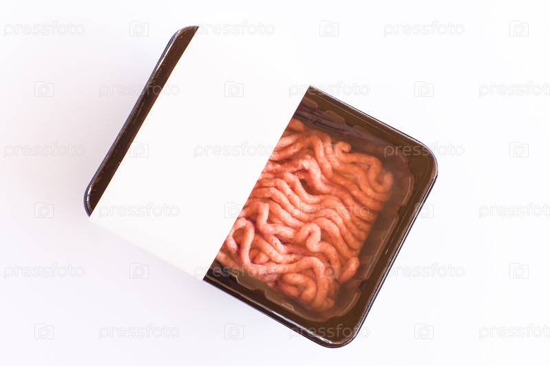 Фарш в вакуумной упаковке на белом фоне. вид сверху. макет логотипа для дизайна