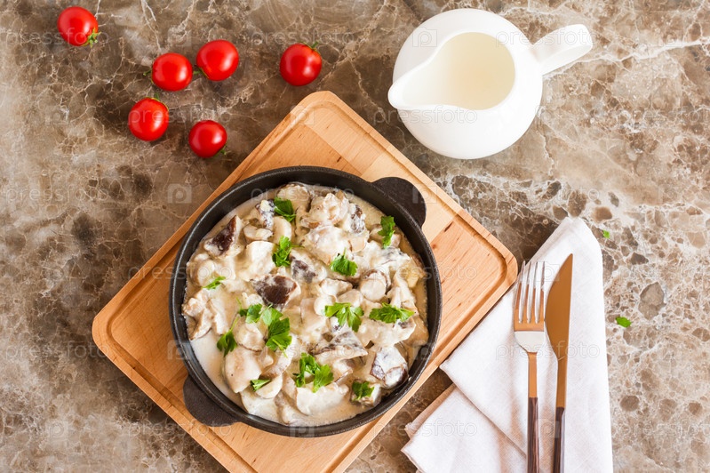 Сливочный соус из белых грибов со специями и зеленью в сковороде на деревянной подставке. диетическое питание. вид сверху