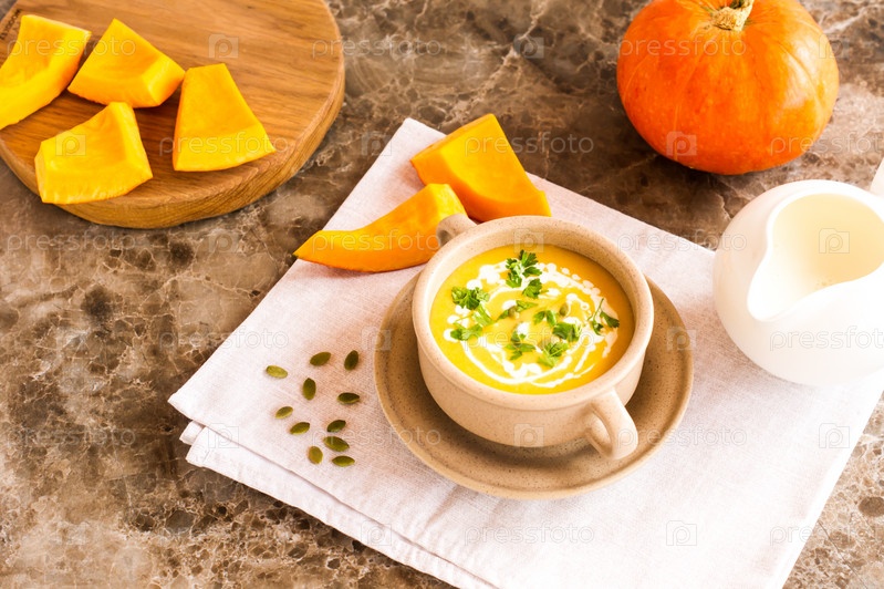Крем-суп из тыквы, кусочки тыквы на деревянной доске, молочник со сливками на мраморном столе