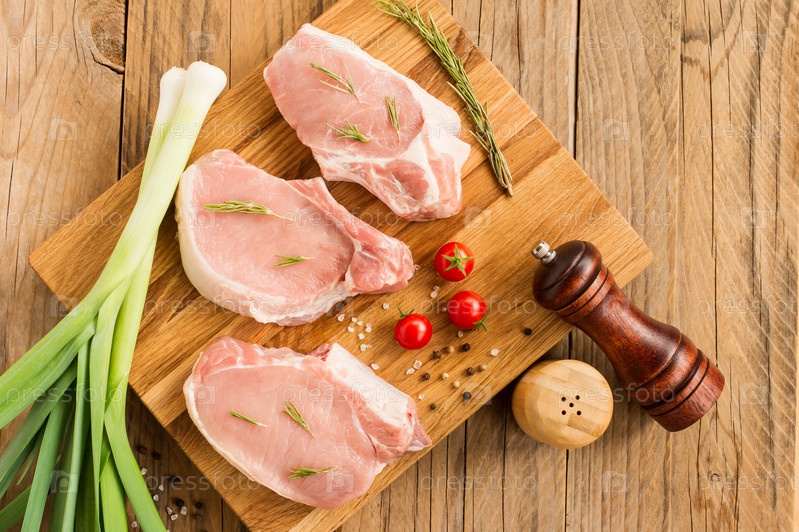 Сырой стейк из молодой свинины на кухонной доске и деревянный стол с луковой зеленью, розмарином, помидорами