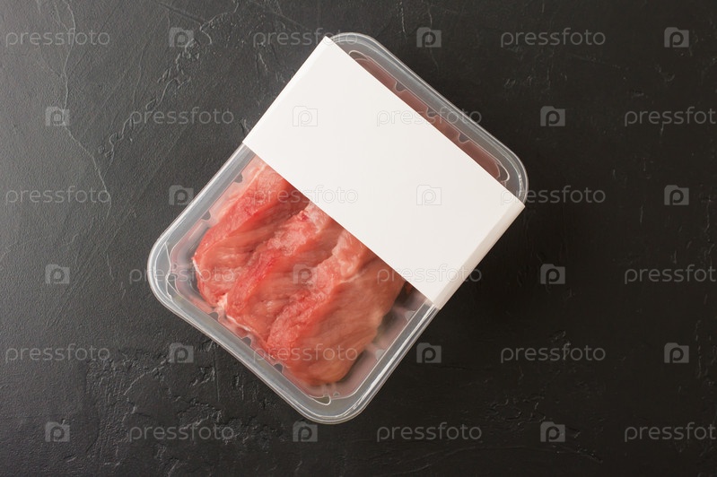 Идеальная сырая вырезка в пластиковой упаковке на черном фоне. вид сверху. дизайн логотипа