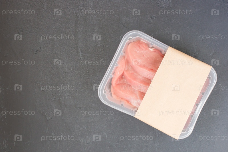 Сырой стейк, антрекот в пластиковой вакуумной упаковке на черном фоне. дизайн макета логотипа