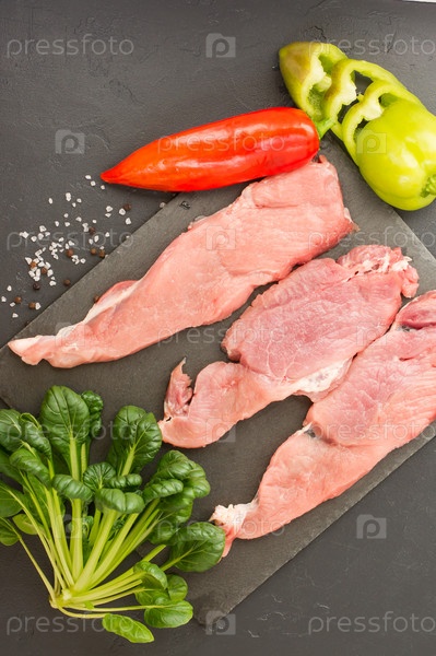Свежее мясо фермы на грифельной доске и черный фон с овощами и зеленью шпината. вид сврху. вертикальное изображение