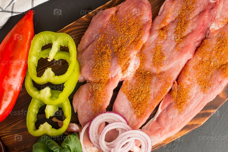 Приготовленные для выпечки свежие отбивные из отборного мяса с паприкой, луком на кухонной доске. вид сверху. близкий угол