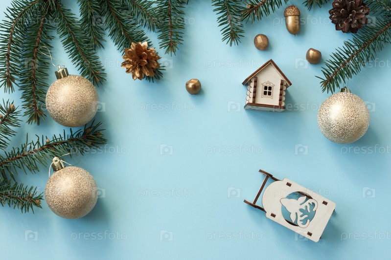 Синий новогодний фон с серебряными шариками, орехами, деревянными игрушками и еловыми ветками. плоская планировка. вид сверху