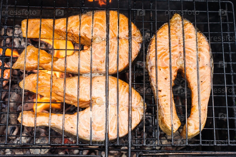 Стейки из свежей лосося на гриле. концепция приготовления пищи на улице, во дворе