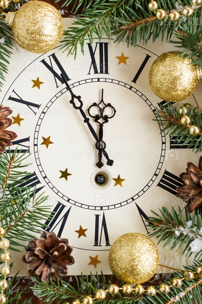 Ретро часы на новую ночь с золотыми шариками, еловыми ветками, шишками, бусинами