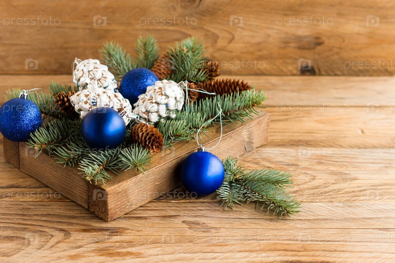 Деревянная коробка с рождественскими голубыми шарами и серебряными шишками на деревенском столе. концепция встречи нового года и уютного Рождества