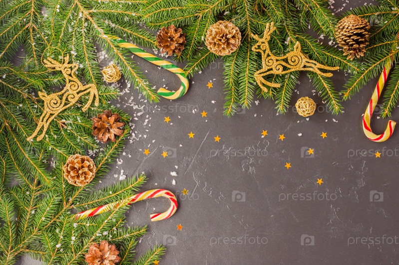 Рождественский праздничный фон с еловыми ветвями, золотыми оленями и шишками, традиционное украшение - карамель - тростник, конфетти из звезд