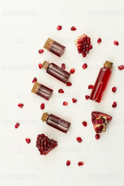 Вид сверху на бутылки с пробковой крышкой с гранатовой косметикой для натурального ухода за кожей. крупный план