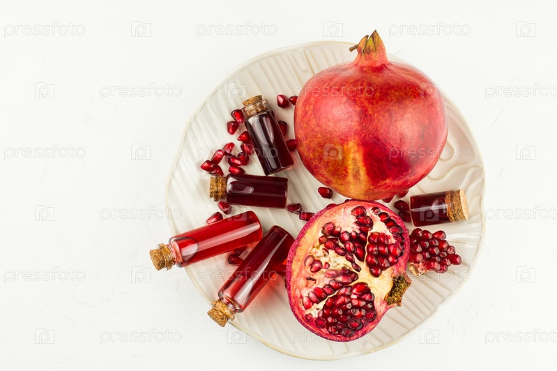 Большая керамическая тарелка с флаконами косметики из семян граната и плодов граната. вид сверху. белый фон