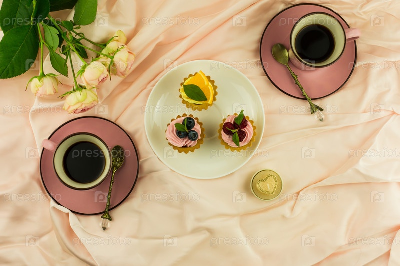 День святого валентина.завтрак на двоих. две чашки свежесваренного кофе, мини-торилья со сливками и фруктами. концепция романтического завтрака