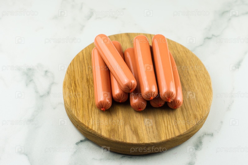 Свежие сырые колбасы на деревянной разделочной доске и мраморном фоне