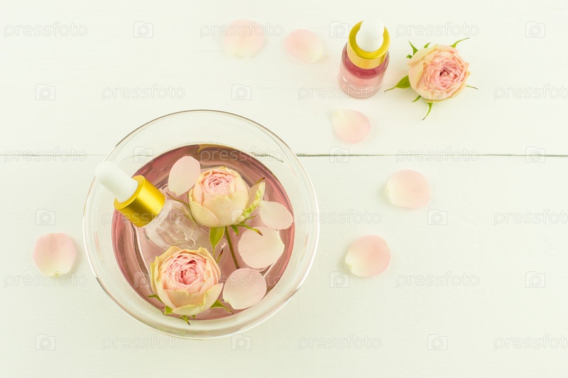 Розовая косметическая вода в миске с лепестками роз, флаконы-капельницы с экстрактом роз на белом фоне. вид сверху