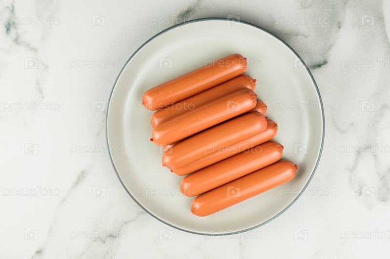 Вид сверху на серую керамическую тарелку со свежими сырыми сосисками для быстрого приготовления. мрамор серый фон