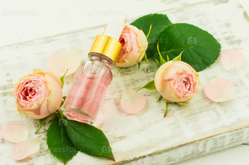 Экстракт лепестков розы в стеклянной косметической бутылке на фоне бутона розы и белого подиума. антивозрастной уход за лицом