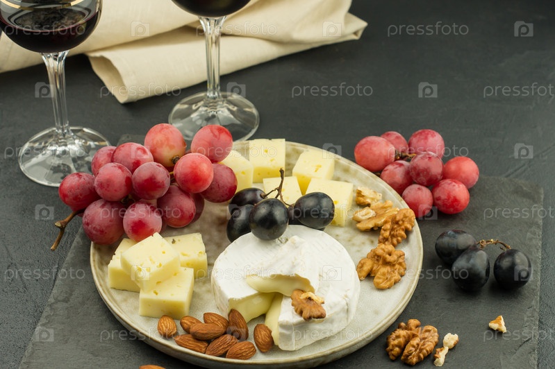 Тарелка сыра Камамбер, ломтики сливочного сыра, различные орехи и сочный виноград. два бокала красного вина на черном фоне