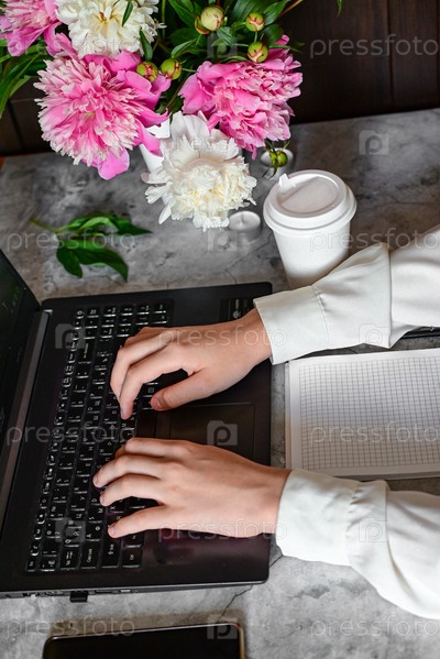 Молодая девушка в белой рубашке работает на ноутбуке с кружкой кофе, удаленной работой и образованием