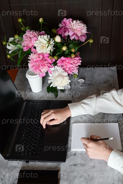Молодая девушка в белой рубашке работает на ноутбуке с кружкой кофе, удаленной работой и образованием