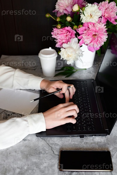 Молодая девушка в белой рубашке работает на ноутбуке с кружкой кофе, удаленной работой и образованием