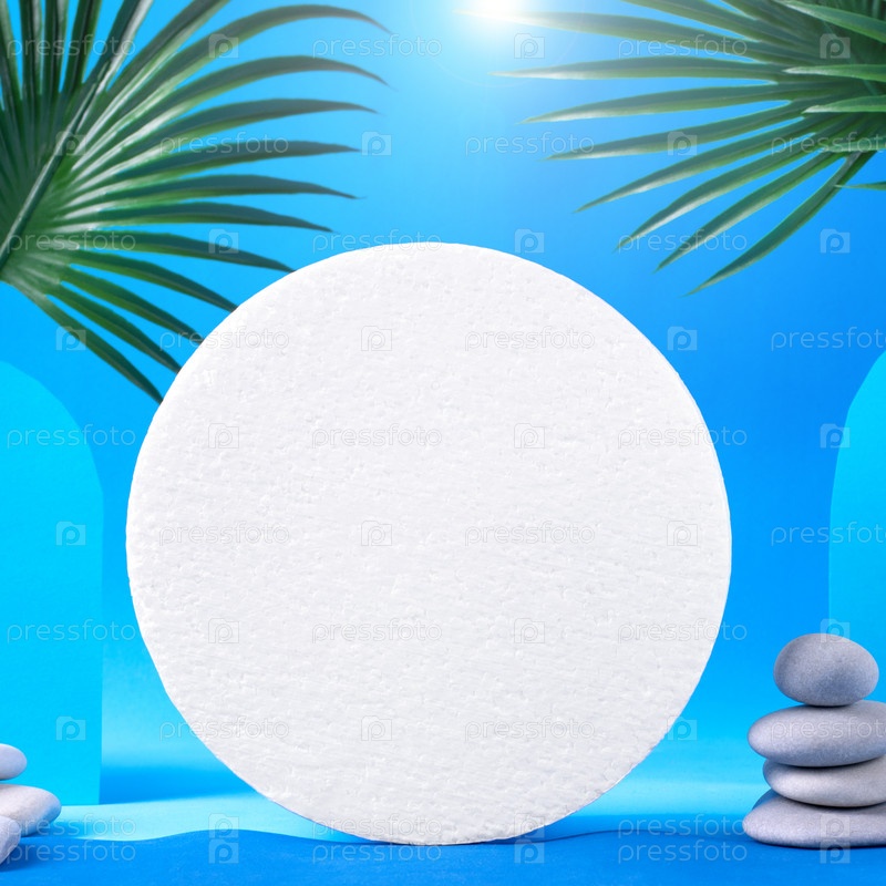 Макет косметического продукта с белым кругом на синем фоне с пальмовыми листьями и камнями. Тропический фон или витрина с копией пространства