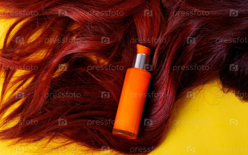 Средство по уходу за волосами в оранжевой бутылке и рыжие волосы на желтом фоне. Мокап с немаркированной косметикой. Шампунь, кондиционер или маска для окрашенных волос