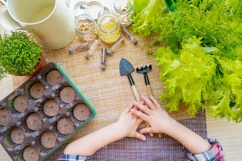 Торфяные горшочки, инструменты и почва готовы к посадке семян. Выращивание рассады для сада. Плоская раскладка с детскими руками