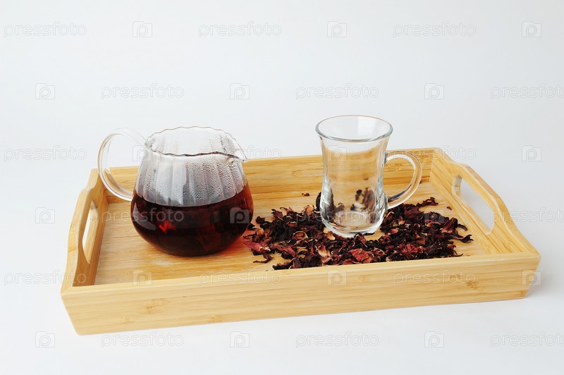 Чай из сушеных лепестков цветков граната заваривают в стеклянном чайнике на бамбуковом подносе. Красивый рубиновый настой. Белый фон. Цветочный напиток, концепция здорового питания