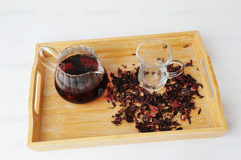 Чай из цветков граната заваривают в стеклянном чайнике. Бамбуковый поднос. Красивый рубиновый настой. Цветочный напиток, здоровое питание