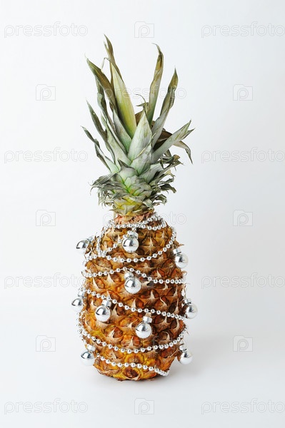 Ананас украшен как новогодняя елка. Серебряные бусы и шарики. Белый фон
