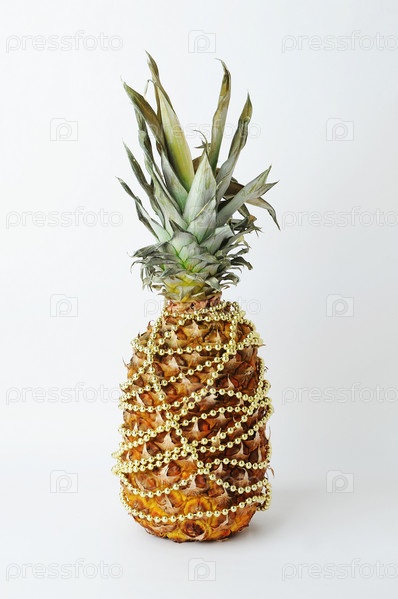 Ананас украшен как новогодняя елка. Гирлянда из золотых бусин. Белый фон. Новогодняя идея