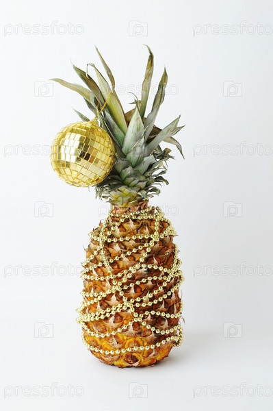 Ананас украшен как новогодняя елка. Гирлянда из золотых бусин. Золотой блестящий отражающий диско-шар. Белый фон. Новогодняя идея