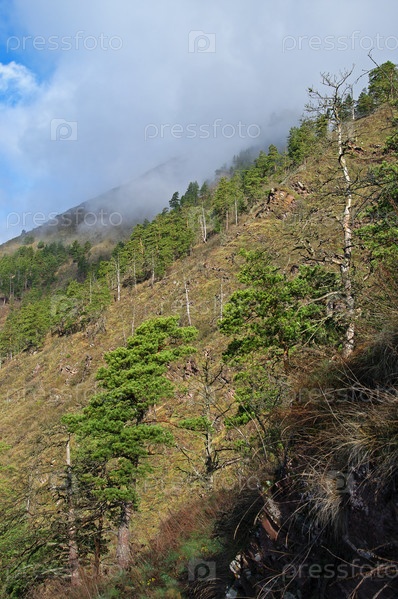 Облако легло на склон и скрыло вершину горы. Долина реки Аксаут, Карачаево-Черкесия, Северный Кавказ, Россия. Солнечный день в начале мая