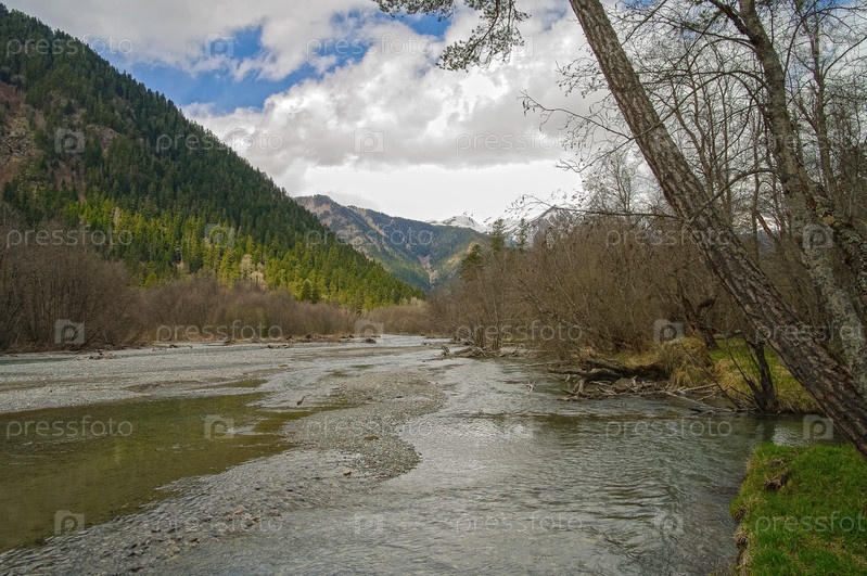 Небольшая речка в Кавказских горах. Окрестности поселка Архыз. Карачаево-Черкесия, Северный Кавказ, Россия. Солнечный день в начале мая