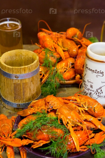Пиво с раками возле деревянной бочки. Октоберфест