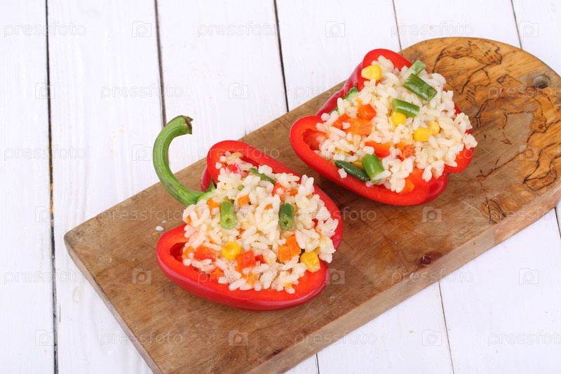 Перец, фаршированный рисом и овощами на белом деревянном фоне