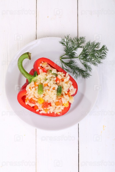 Перец, фаршированный рисом и овощами на белом деревянном фоне