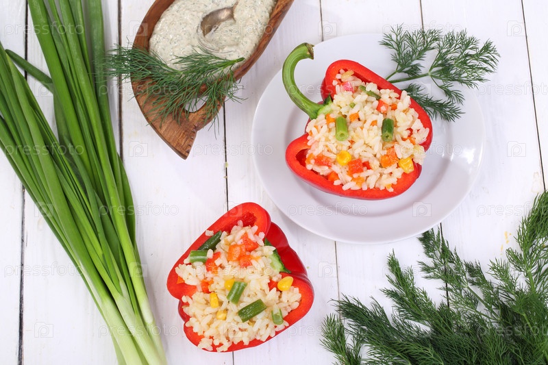 Перец, фаршированный рисом и овощами на белом деревянном фоне