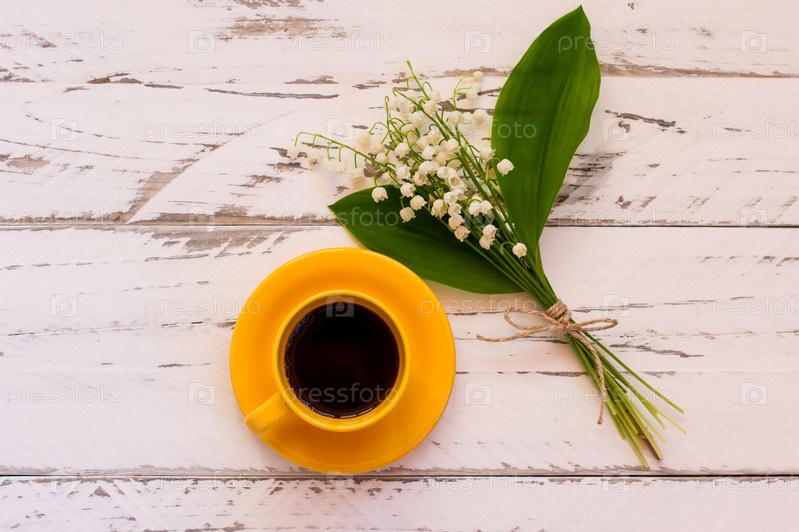 Сервировка утреннего кофейного столика с букетом цветов ландыша. Желтая чашка с черным кофе украшена весенними цветами на деревянном столе, вид сверху